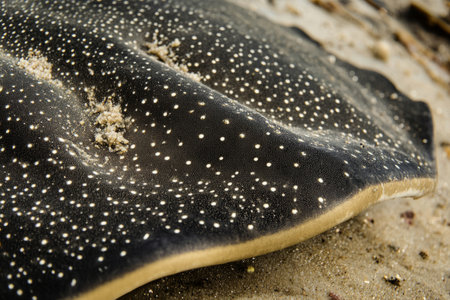 Close-up of stingray skin, rough, pebble-like surface with tiny white speckles.