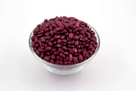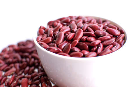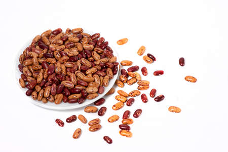 Raw Mexican red kidney beans on white background, food ingredient studio shot.