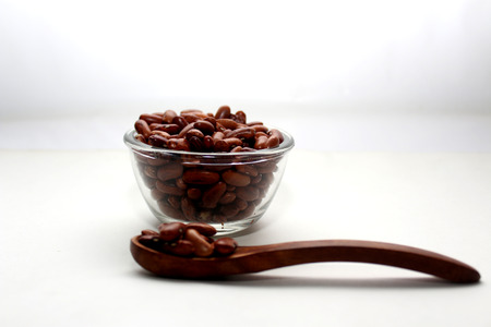Beans are red on a white background. The concept of healthy vegetarian food with copying space