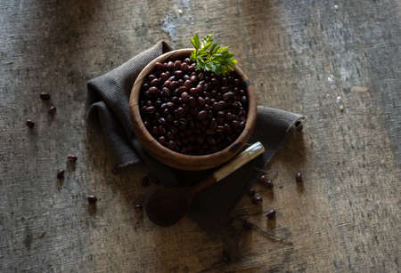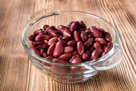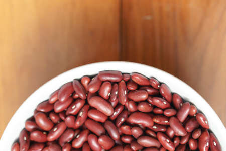 Organic red kidney bean in basket on wood table. Protein nutrition ingredient for vegetarian.