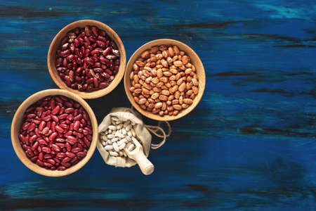 Assortment of kidney beans in wooden dishes and white kidney beans in linen bag on dark blue wooden background, mung bean, red kidney bean, white bean, brown bean.