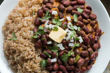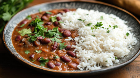 A delightful serving of beans in sauce paired with fluffy rice, garnished with fresh cilantro. Perfect for a nutritious and flavorful meal.
