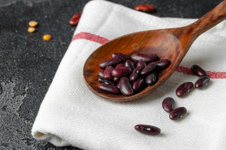 wooden spoon on background of many grains of dried beans top view, red beans texture, food