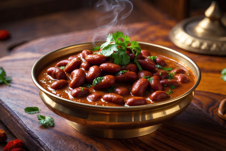 Classic North Indian meal of Rajma Chawal, with kidney beans in a spicy curry served alongside fluffy boiled rice. Fresh coriander adds a pop of color.