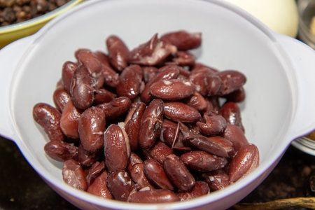 Cooking concept with organic beans in a bowl and ingredients for lobio dish