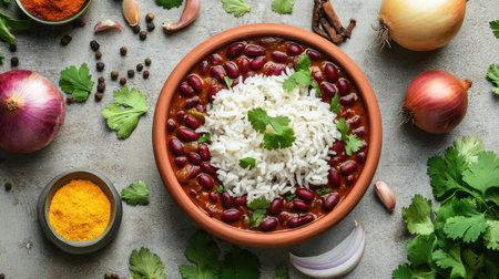 Flat lay of Rajma red bean masala with rice in a clay bowl, surrounded by spices, onions, and fresh cilantro on a rustic concrete table. A hearty North Indian meal.