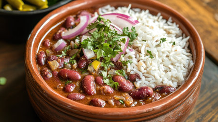 A mouthwatering red bean stew served with fluffy rice, garnished with fresh onion and cilantro. Perfect for an inviting meal that radiates warmth.