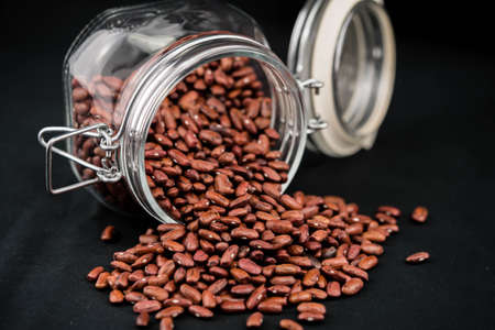 Dry brown bean or kidney bean in glass jar. A valuable source of protein for a healthy vegan diet. White putty background, top view