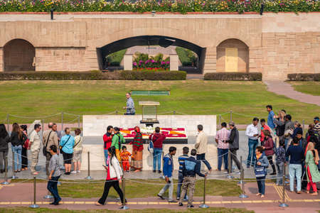 Rajghat, New Delhi, India - February 2020 : Memorial with an eternal flame burns at Mahatma Gandhi body cremation place situated in Shahjahanabad, Old Delhi on western bank of Yamuna river.