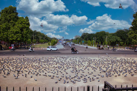 A wide angle shot of a pigeon group and busy highway under cloudy sky with people's daily activities in Jaipur city, India