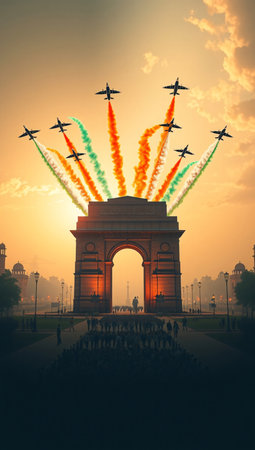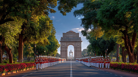 Indian Independence Day parade featuring soldiers marching towards India Gate, symbolizing freedom.