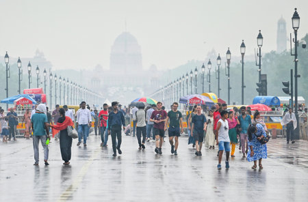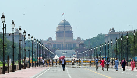 NEW DELHI, INDIA - JULY 10: Visitors during sudden drizzle in the afternoon at Kartavya Path, on July 10, 2024 in New Delhi, India. Heavy rain in several parts of Delhi, Noida and their adjoining areas in the National Capital Region (NCR) brought respite