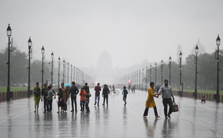 NEW DELHI, INDIA - AUGUST 11: Visitors enjoys rain at Kartavya Path amid monsoon rain, on August 11, 2024 in New Delhi, India. (Photo by Sanjeev Verma/Hindustan Times )