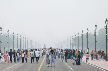 NEW DELHI, INDIA - SEPTEMBER 7 2024 People are seen walking at Kartavya Path during Hazy weather after two days drizzling rainfall, on September 7, 2024 in New Delhi, India. (Photo by Salman Ali/Hindustan Times )
