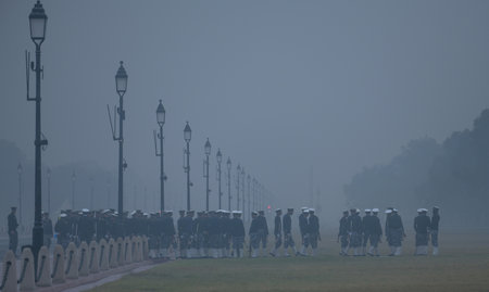 NEW DELHI, INDIA - DECEMBER 29: Indian Navy and Coast Guard Contingent's rehearsing for upcoming Republic day Parade during a cold weather at Kartavya Path on December 29, 2024 in New Delhi, India. North India is reeling under cold weather with temperatur