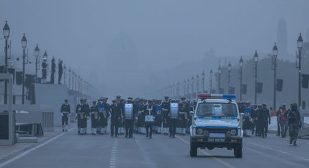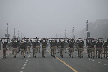 NEW DELHI, INDIA - DECEMBER 28: Delhi Police personnel during rehearsal ahead of Republic Day Parade amid dense foggy and cold morning, at Kartavya Path on December 28, 2023 in New Delhi, India. (Photos by Salman Ali/Hindustan Times)