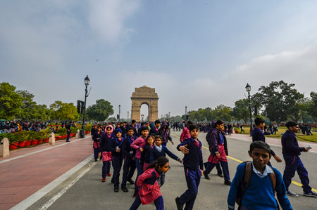 NEW DELHI, INDIA - DECEMBER 30: School students enjoy India gate during the Clean and cold Afternoon on December 30, 2024 in New Delhi, India. North India is reeling under cold weather with temperatures plummeting across several states. As per IMD, the mi