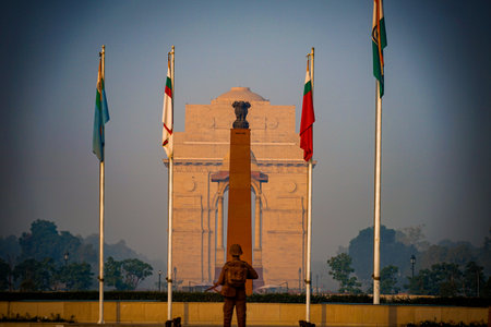 Indian national flag against india gate backdrop in new delhi