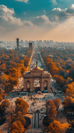 India Gate, A Majestic War Memorial in New Delhi, Bathed in the Warm Glow of the Setting Sun