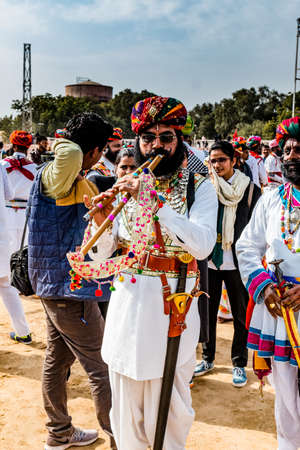 JAISALMER, INDIA - FEB 01,2015-Unidentified traditionally dressed Rajasthani villager attends a cultural procession for the Desert festival held in Jaisalmer, Rajasthan, India.
