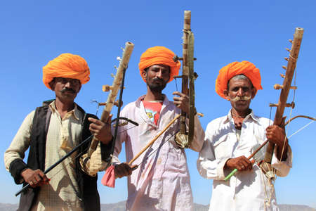 Jaisalmer, Rajasthan, India - July 29, 2019 : Indian musicians in traditional dress playing musical instruments -