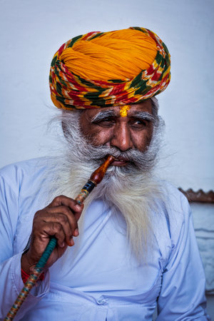 Jodhpur, India - Jan 02, 2020: Portrait of aged Rajasthani man in traditional dress and colorful turban smoking hookah at Mehrangarh Fort in Jodhpur, India