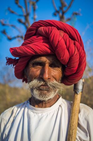 GODWAR REGION, INDIA - 13 FEBRUARY 2015: Rabari tribesman holds traditional axe and stands on field. Rabari or Rewari are an Indian community in the state of Gujarat.