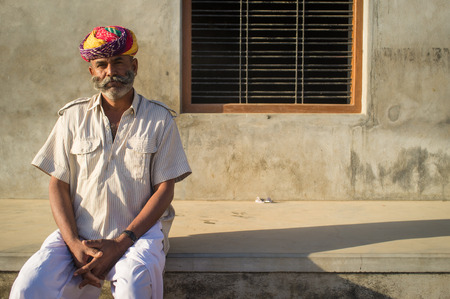 GODWAR REGION, INDIA - 14 FEBRUARY 2015: Adult Indian man with colorful turban and curled mustache sits in street.