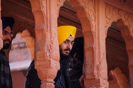 JAISALMER, RAJASTHAN, INDIA November 2018, Tourist in traditional Rajasthani turban and costume near Kothari's Patwon ki Haveli