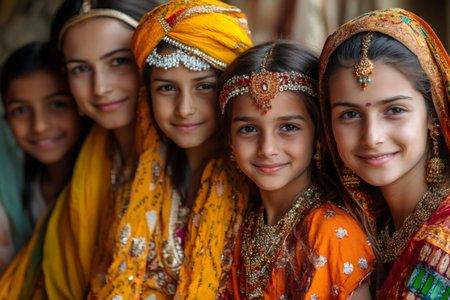 Five young girls wearing traditional Indian dresses and jewelry are smiling together for a portrait