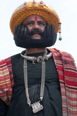 BIKANER, INDIA - JANUARY 11, 2019: Indian men with a long mustaches in national clothes poses for a photo during Camel Festival in Rajasthan
