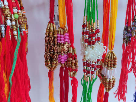 Different color rakhi arranged in line in shop for sale during raksha bandhan festival