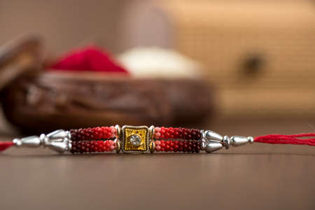 Indian festival: Raksha Bandhan background with an elegant Rakhi, Rice Grains and Kumkum. A traditional Indian wrist band which is a symbol of love between Brothers and Sisters.