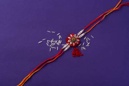 Raksha Bandhan, Indian festival with beautiful Rakhi, Rice Grains and flower. A traditional Indian wrist band which is a symbol of love between Sisters and Brothers