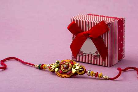 Raakhi and a gift for the sister given by brother on the occasion of Raksha Bandhan. Indian festival Raksha Bandhan background with an elegant Rakhi.