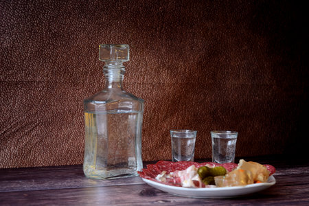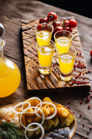 Traditional drink vodka in glasses, with a snack in the form of cold cuts and bacon, cucumbers, preservation. Russian festive national table.