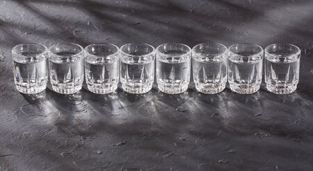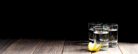 Glasses with Russian vodka on a brown wooden background. Copy space