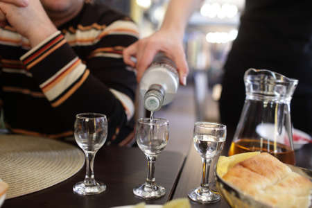 Turkish and Greek Traditional Dinning Table with Special Alcohol Drink Raki. Ouzo and Turkish Raki is a dry anise flavored aperitif that is widely consumed in Turkey, Greece, Cyprus and Lebanon