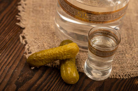A glass decanter with vodka, a glass of vodka and pickled cucumbers on a background of homespun fabric with a rough texture. Close-up Selective focus