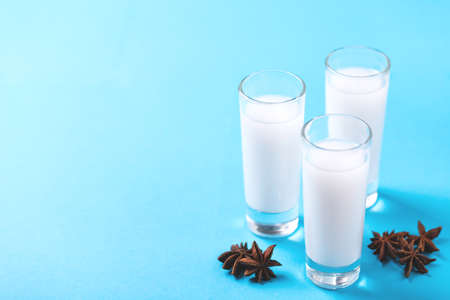 Arabic alcohol drink Raki with anis on blue background.Turkish and Greek Traditional aperitif arak, Ouzo