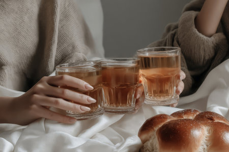 Cozy gathering: close-up of two females enjoying hot drinks with pastries indoors.