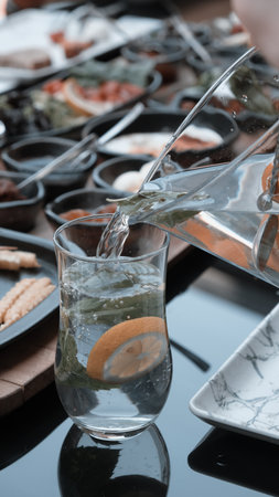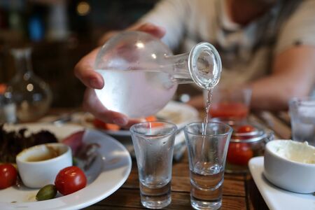 Turkish and Greek Traditional Dinning Table with Special Alcohol Drink Raki. Ouzo and Turkish Raki is a dry anise flavored aperitif that is widely consumed in Turkey, Greece, Cyprus and Lebanon