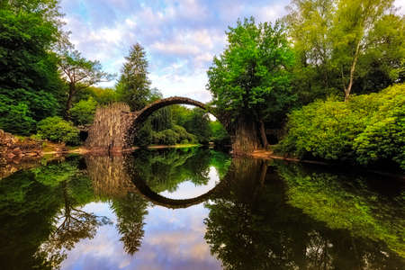 Picturesque narrow bridge in the park Kromlau, Germany. The Devil's Bridge on the Rakots River. The basalt columns of the bridge form a perfect circle with their reflection in the water.