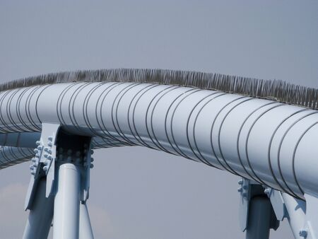 Details of urban architecture, gray lines of the bridge against the light blue sky background.