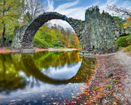 Rakotz Bridge (Rakotzbrucke, Devil's Bridge) in Kromlau, Saxony, Germany. Colorful autumn, reflection of the bridge in the water create a full circle.Unusual and interesting places in Germany.