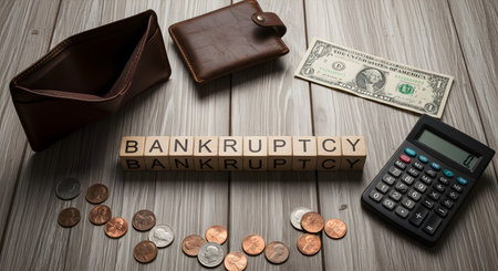 A bankruptcy concept with blocks spelling the word bankruptcy, an empty wallet, coins, a dollar bill and a calculator on a wooden surface.