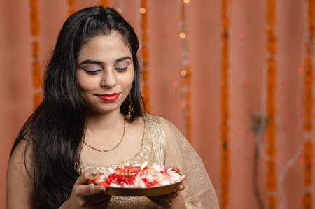 Beautiful Young Indian woman holding burning Diya and looking at camera. Diwali or deepawali celebration with light and flowers decor in background.