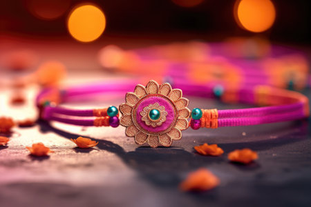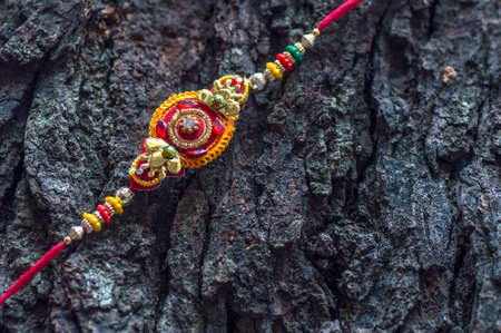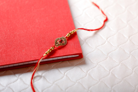 selective focus on Rakhee or holy thread on Indian festival Raksha Bandhan