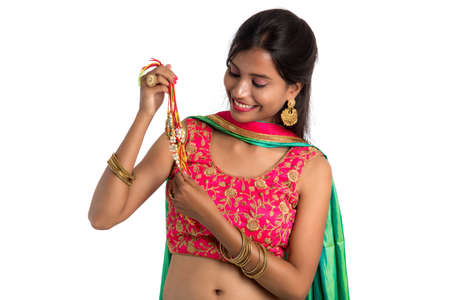 Beautiful girl showing Rakhi on occasion of Raksha bandhan on a white background. Sister tie Rakhi as symbol of intense love for her brother.