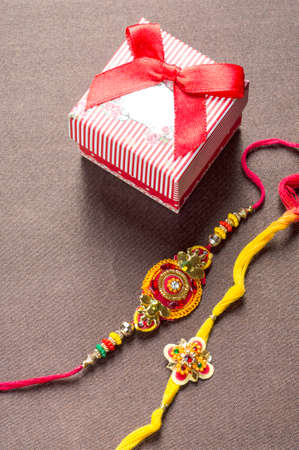 Raakhi and a gift for the sister given by brother on the occasion of Raksha Bandhan. Indian festival Raksha Bandhan background with an elegant Rakhi.